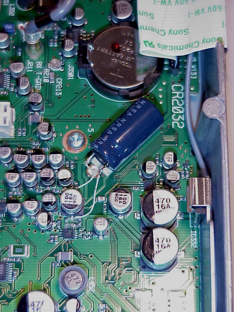 The Modification: You will need a 1000µF 16V electrolytic capacitor (Radio Shack #272-958), and some #30 insulated wire-wrap wire (Radio Shack #278-502). Prepare the capacitor by clipping the leads very short. Leave about 1/8 of an inch on each end to solder the fine wire to. The capacitor leads themselves are too large to solder directly to the pcb pad.