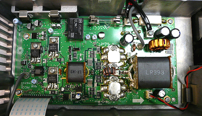 In Fig.1, the two RD100HHF MOSFET output devices can be seen between the input (centre) and output (right) transformers. The pair of RD15HFV1 drivers are located to the left of the input transformer, and the 2SC1971 BJT pre-driver to the left of the drivers. All these transistors are Mitsubishi parts.