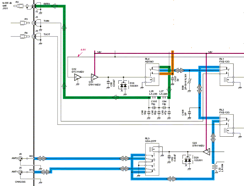 A: No, this is not the case. If we follow the RF signal path on the CTRL-A Unit from ANT1 and ANT2 to the RFRX input (RF-B Unit), we see that when RL1, RL2, RL3 and RL4 are released, the signal from ANT1 is routed via RL3/1 NC, RL2 NC, RL1 NC, RL4 NC. L27 and L28 to J2 (RFRX). ANT2 is earthed to chassis via RL3/2 NC. (IC-756Pro3 Service Manual, p. 10-5).