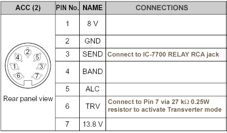 The secondary receiver must be muted and protected whilst transmitting on the primary transceiver. As the IC-756Pro3 does not have a muting input as such, we are resorting to a "trick" to mute the IC-756Pro3 and protect its front end. The IC-756Pro3 is placed in theTransverter mode by connecting a 27 kΩ 0.25W resistor between Pins 6 and 7 of its ACC(2) socket. This activates the bi-directional XVERT RCA jack for receive and transmit. The IC-756Pro3 can be keyed from the IC-7700 by connecting Pin 3 of its ACC(2) socket to the IC-7700 RELAY RCA jack. Refer to Table 1.