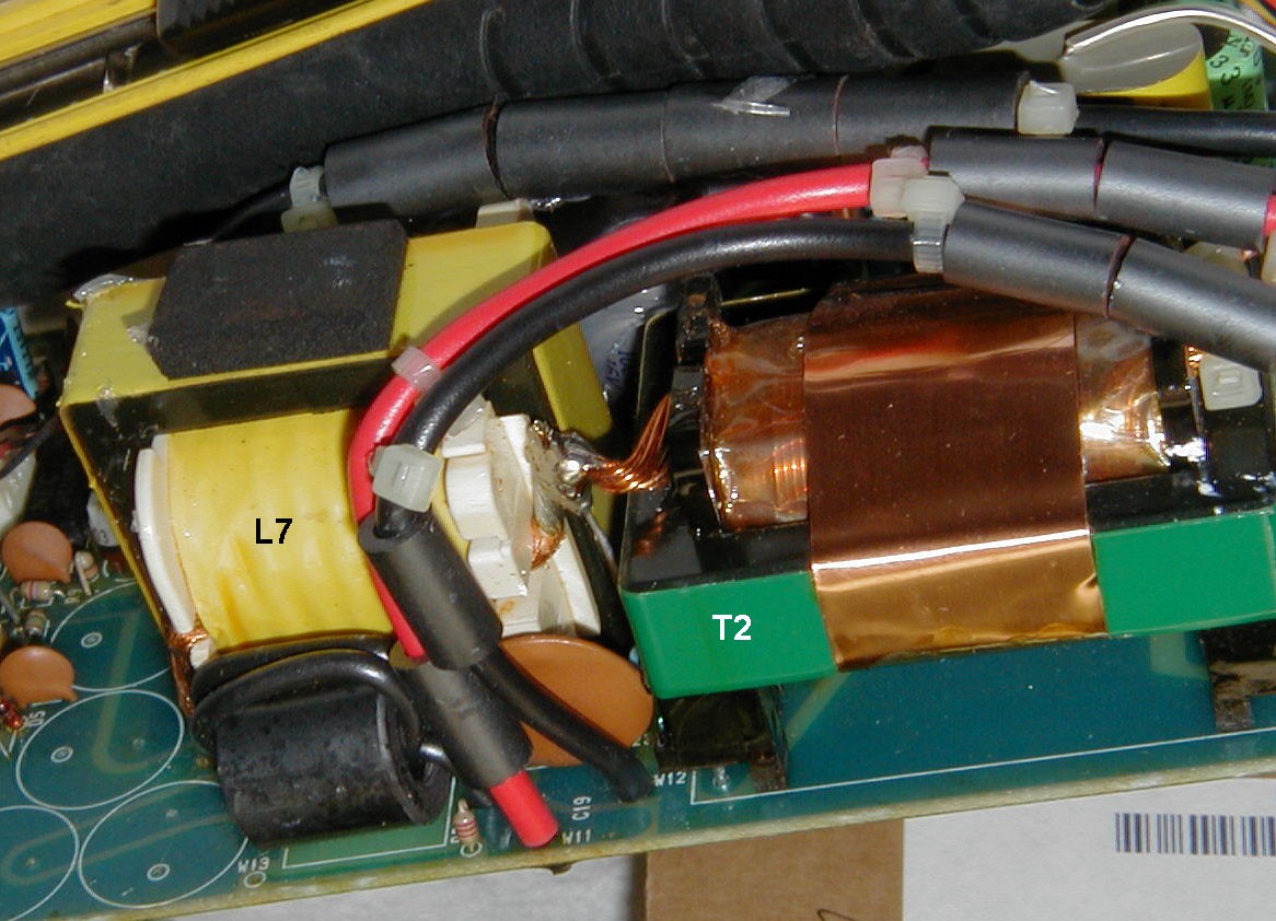 Fig. 4 is a view of the REG Unit board showing the positions of L7 and T2, with the electrolyticcapacitors to the left of L7 removed. After securing L7 to the board with RTV, the gap between L7 and T2 was filled with RTV to further minimize movement of L7. (This picture was takenprior to the RTV application). In stock form, L7 was held in position via one heavy lead on the left side of L7, and the other heavy lead which can be seen soldered to the lead from T2. Movement of L7 was transmitted to the circuit board trace through the left lead, causingthe trace to flex and break.