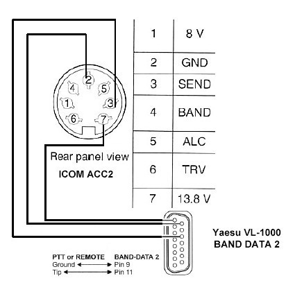 If remote power on/off switching from the exciter is desired, connect Band Data 2, Pin 1 (+13.6V) to ACC2 Pin 7 (13.8V) as illustrated here. Set the REMOTE switch on the VL-1000 rear panel to ON (up).